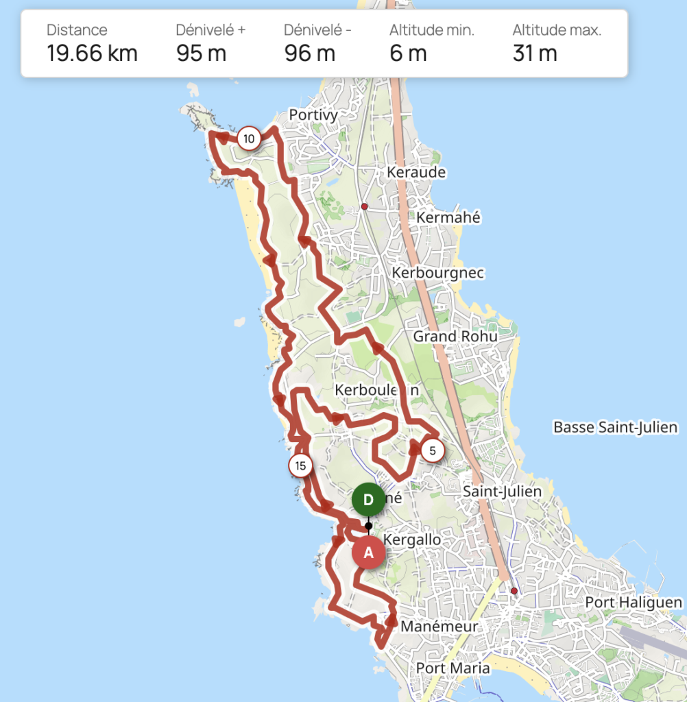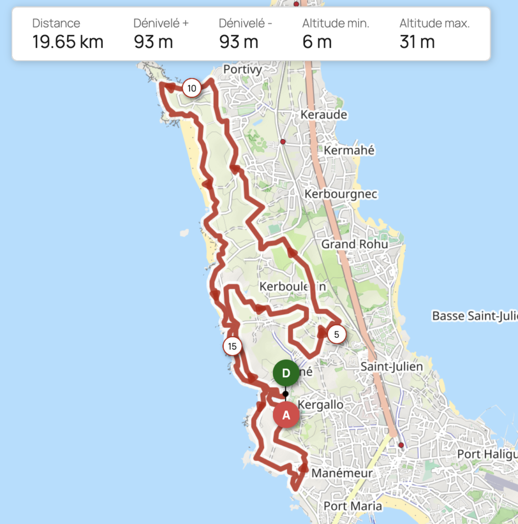 Modification cette année : maintenant les 2 derniers Km empruntent le sentier cotier ( GR 34 ) comme le 20 Km